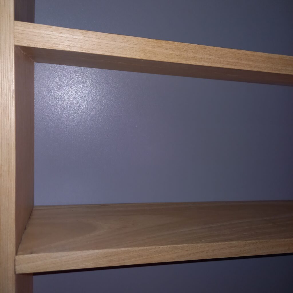 Les étagères sont solidement fixées, elles présentent des bords légèrement chanfreinés, offrant une sensation de douceur au toucher. Les étagères suffisamment épaisses et massives, contribuant à la stabilité du meuble tout en mettant en valeur la texture du bois.